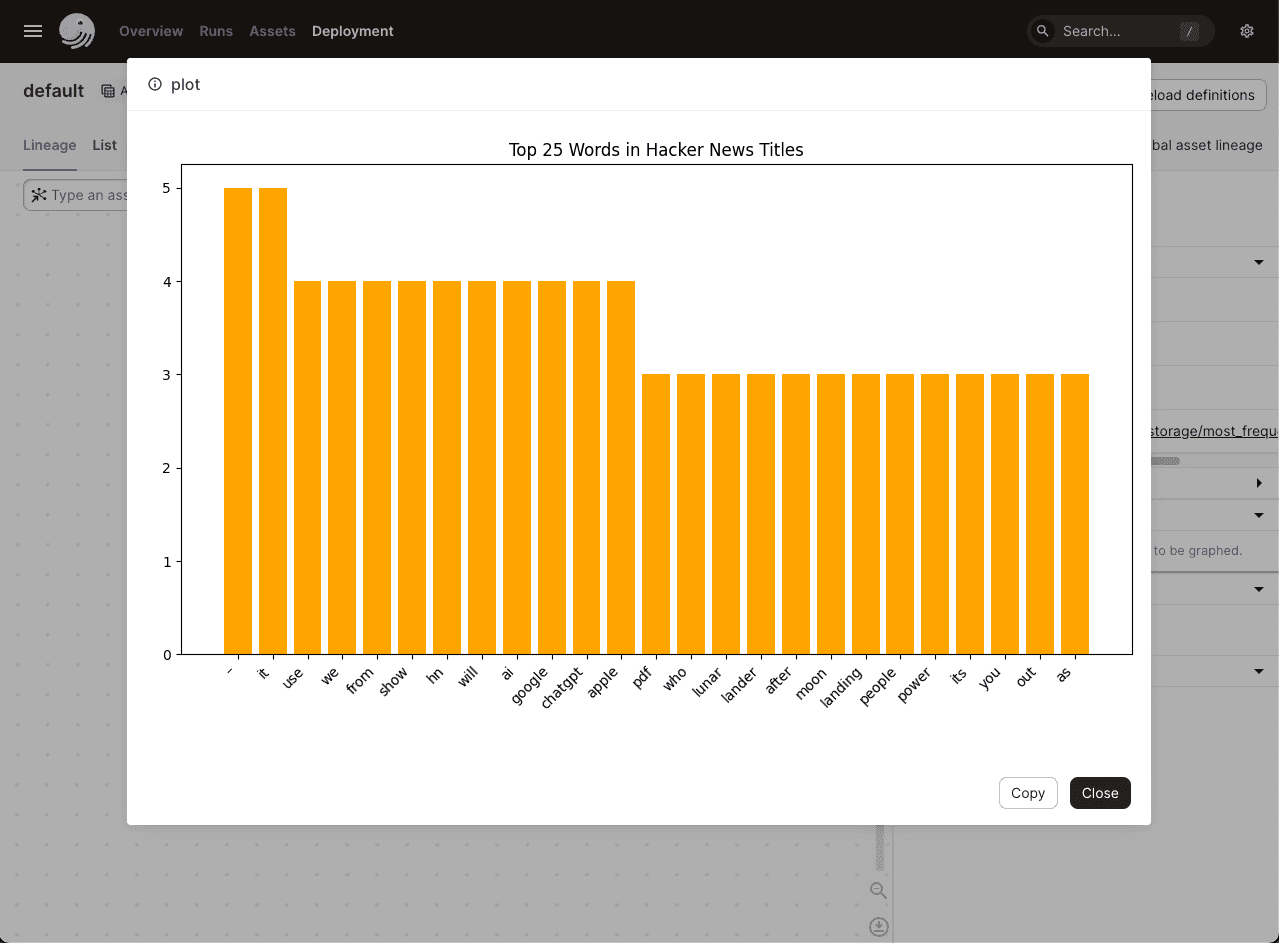 Reload your definitions and rematerialize your assets. The bar chart will be visible with the rest of your materialization metadata for the most_frequent_words asset. The path key in the metadata will contain a link that says [Show Markdown]. Clicking on the link will open the preview in the Dagster UI. The bar chart will change throughout the day as the top stories change. Here's an example of what most_frequent_words looked like at the time we wrote this tutorial: